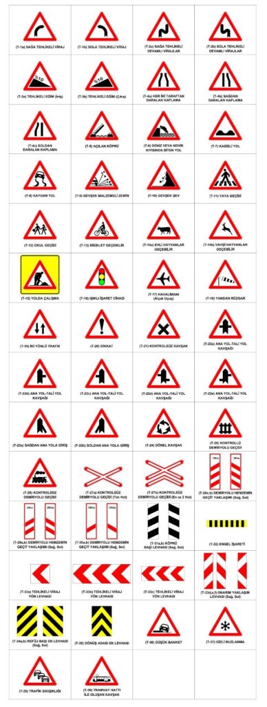 Başta üçgen işaretler olmak üzere tehlike işaretlerinin sayısı 52’dir.En yaygın uyarı işaretleri sağa dönüşler, sola dönüşler, engebeli yollar, yaya geçitleri ve okul geçitleri gibi işaretlerdir.