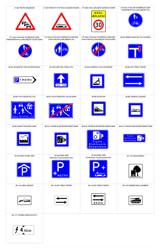 Trafik levhaları grubuna eklenen son işaretler bu kategoride yer alıyor. Sürücüleri ve yayaları yoldaki olası bir tehlikeye karşı uyarmak ve bilgilendirmek için kullanılan yeni standart trafik işaretleri arasında trafik sıkışıklığı, tramvay durağı ve trafik elektronik denetleme gibi levhalar bulunuyor.